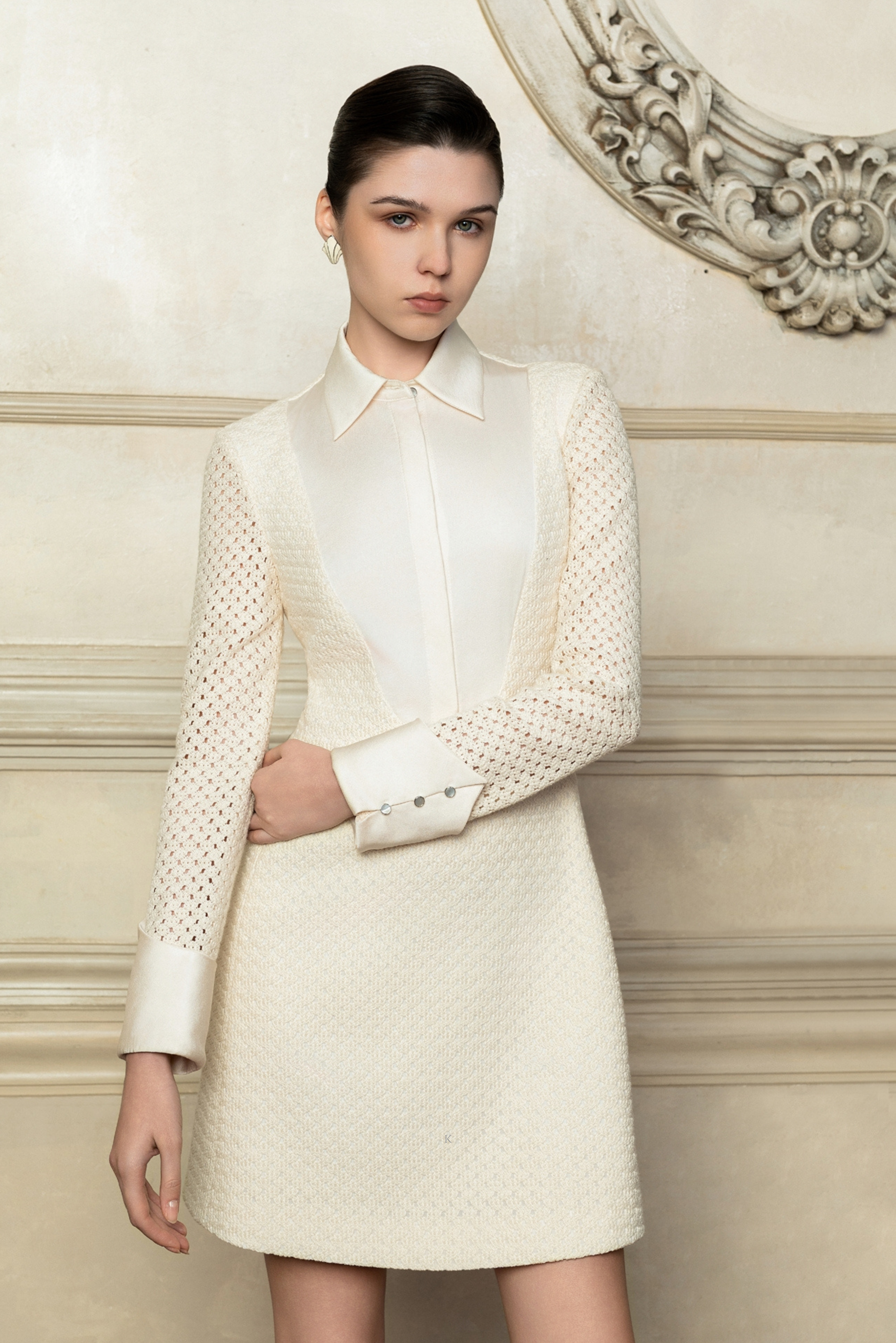 ⩥ Defined by a clean A-line silhouette, KANE moves with understated confidence. A classic turn-down collar and long, sculpted sleeves frame the body with quiet authority, while the mini length (87 cm) introduces lightness and versatility. Unlined for purity and ease, the dress maintains visual clarity through proportion and precision.